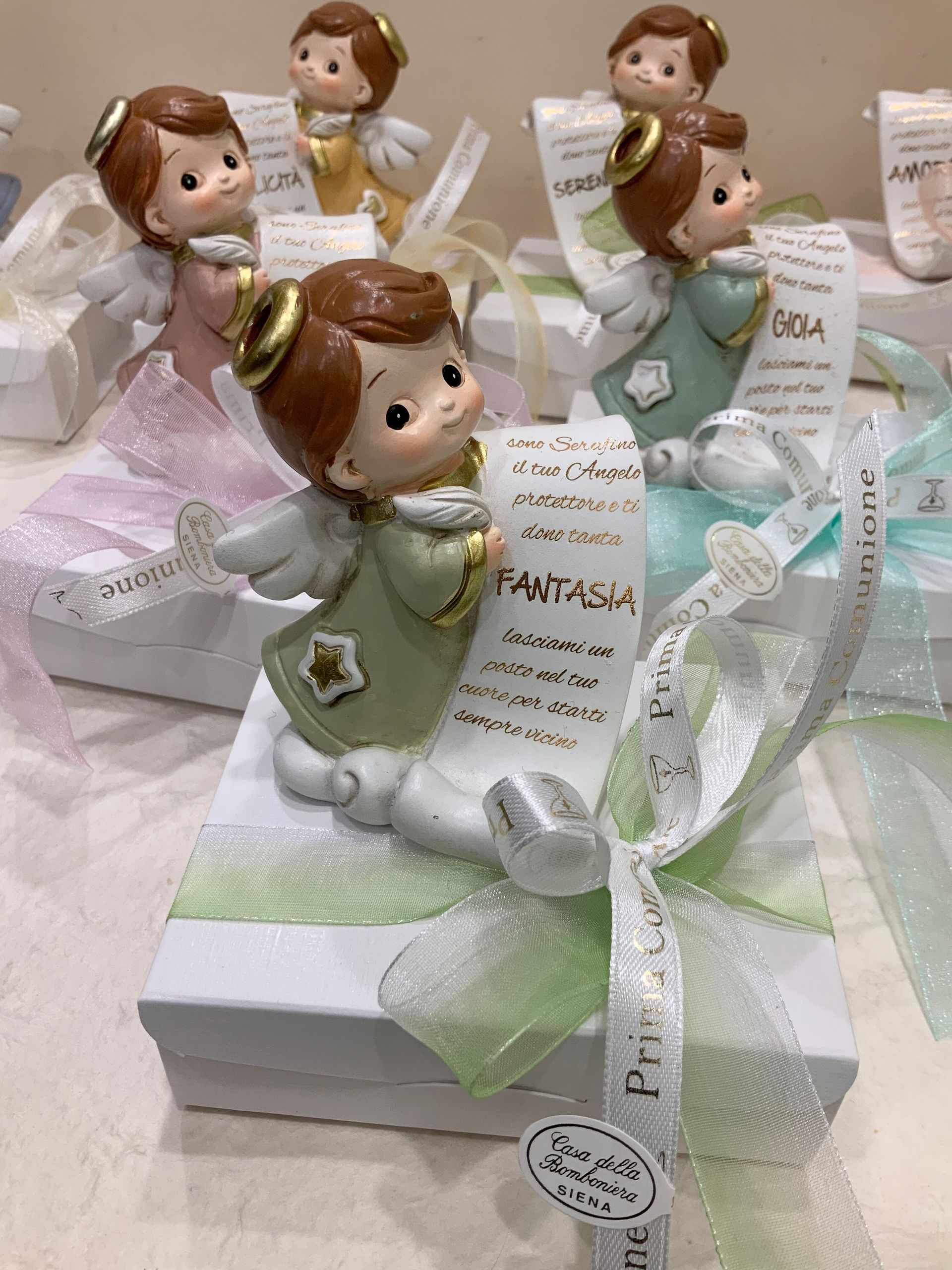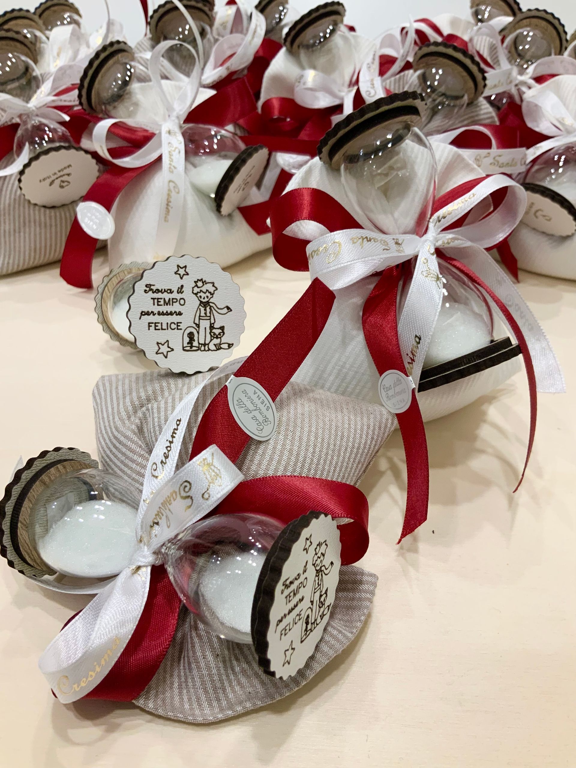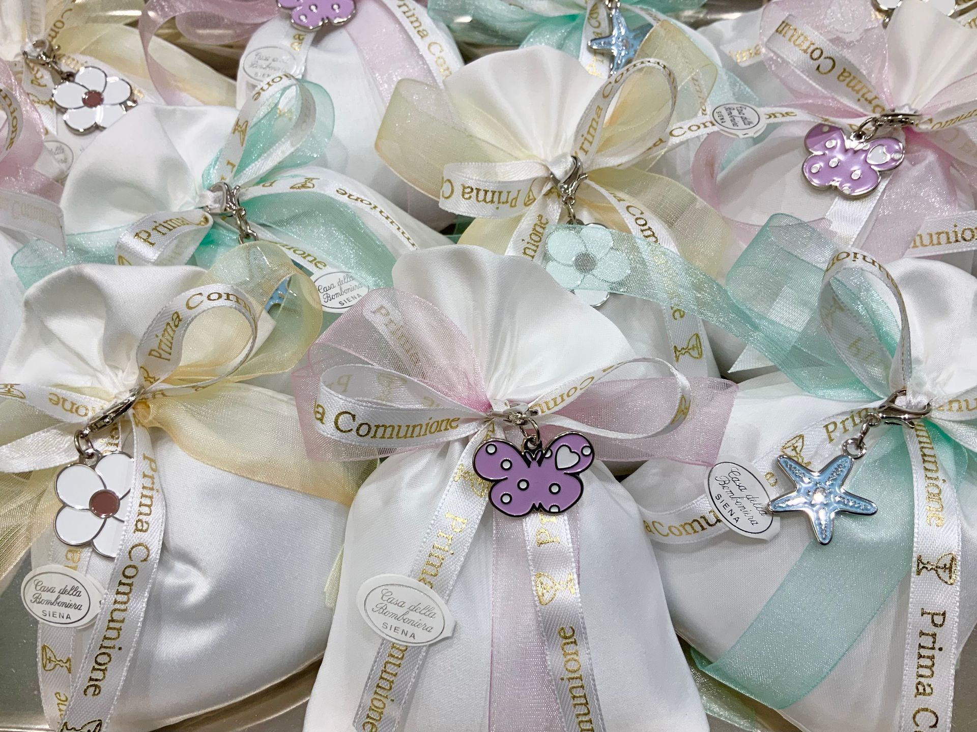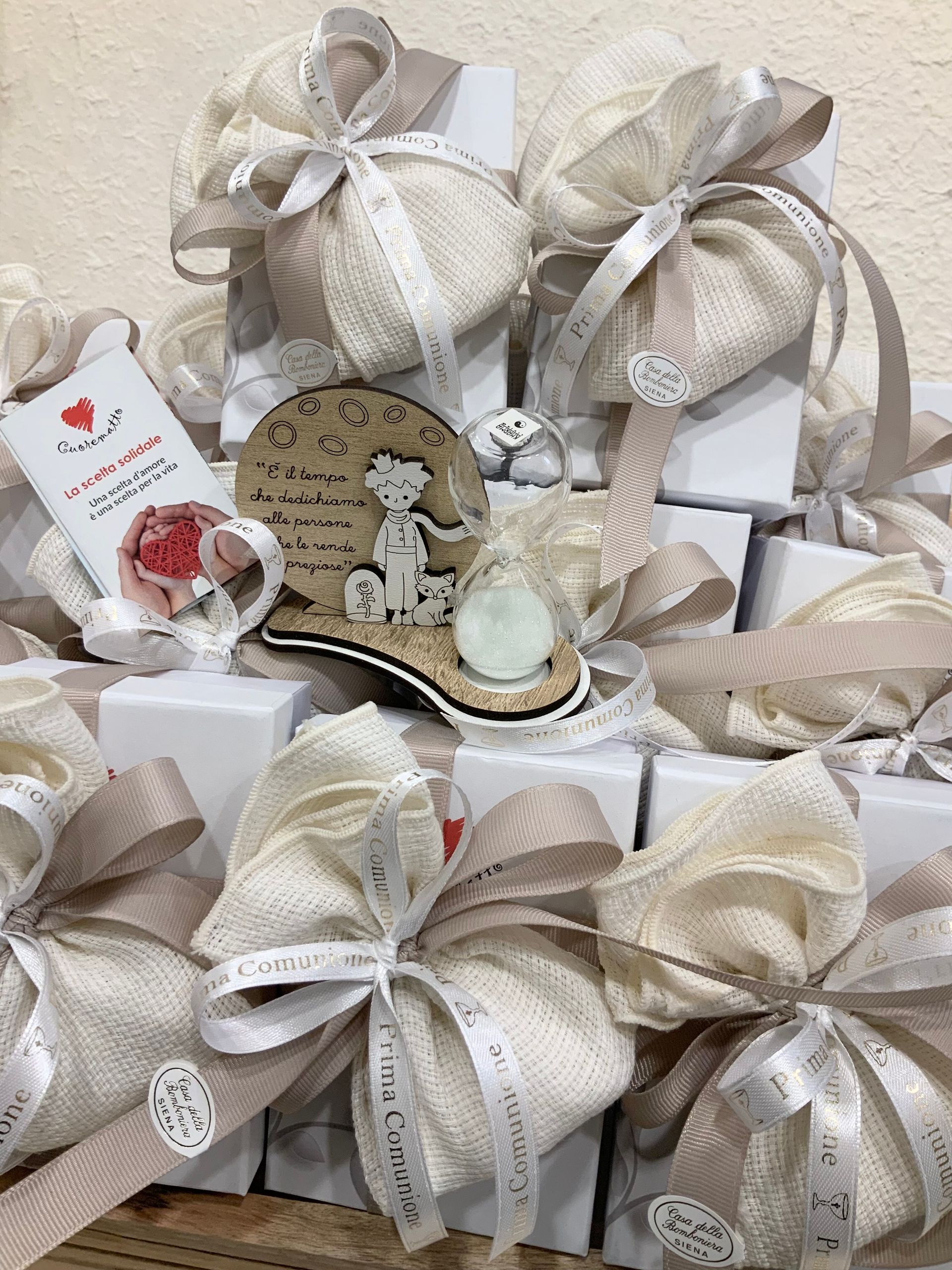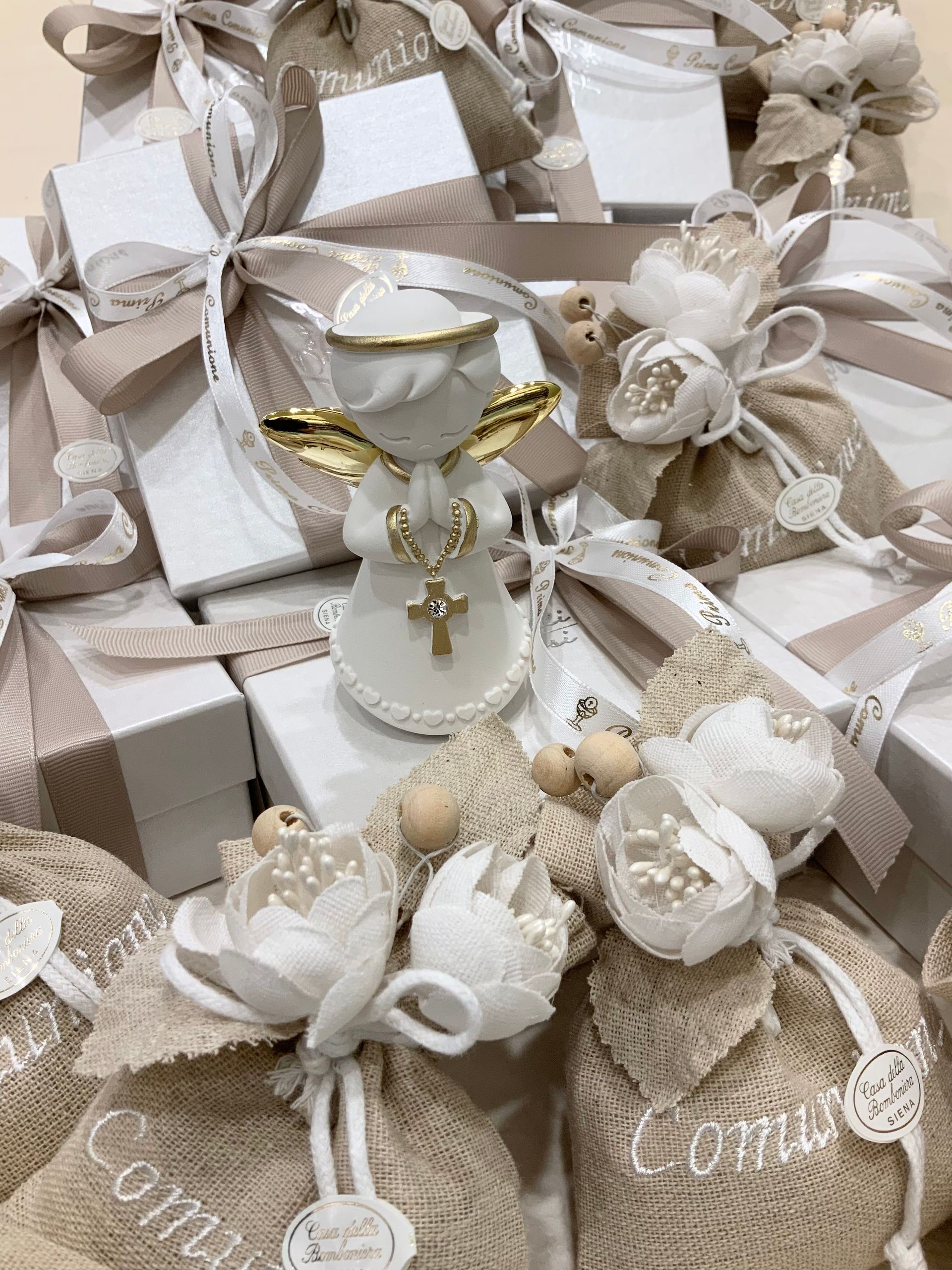 Casa Della Bomboniera è sempre al tuo fianco per festeggiare i momenti più importanti nella vita di ogni componente della tua famiglia. La Prima Comunione è una festa particolarmente importante, perché il tuo bambino si affaccia per la prima volta al sacramento dell'Eucarestia, seguito poi dalla Cresima che conferma le promesse fatte dai genitori nel momento del Battesimo, abbracciando totalmente la fede cristiana. Nel negozio di Siena troverai una vasta scelta di bomboniere specifiche per Comunione e Cresima: dalle statuine, portachiavi, charms, segnalibri e tanti altri cadeaux applicati su sacchetti o scatoline portaconfetti. Grazie al nostro aiuto, le bomboniere per la Comunione e per la Santa Cresima diventeranno un ricordo davvero indimenticabile non solo per la tua famiglia, ma anche per tutti i tuoi invitati.